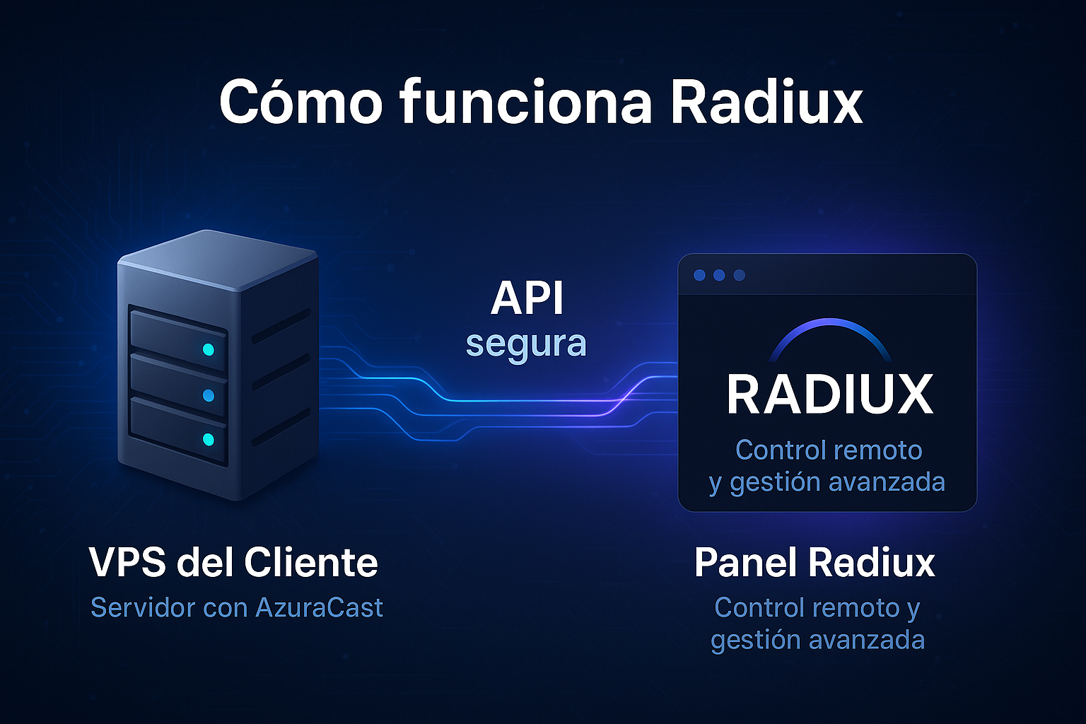 Radiux funciona en 3 pasos claros. Sin texto de más, sin scripts frágiles.